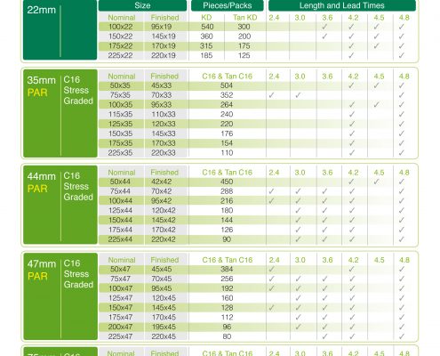 All construction timbers are singulated and stress graded both visually and mechanically to EN 336. A Microtec Goldeneye density scanner determines timbers’ strength by laser scanning technology with an x-ray of each individual piece. An integrated moisture meter ensures consistent moisture content in each pack.